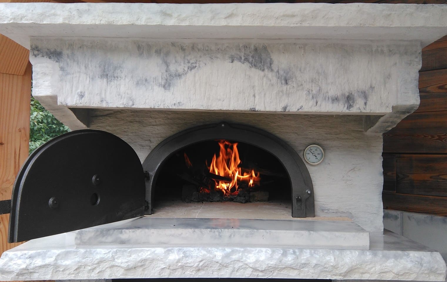 Cuisine d’été en ardoise veiné gris : un four à bois Coffre plat 8575 installé à 45° d’un plan de travail std 105 et un évier perretière de 75cm