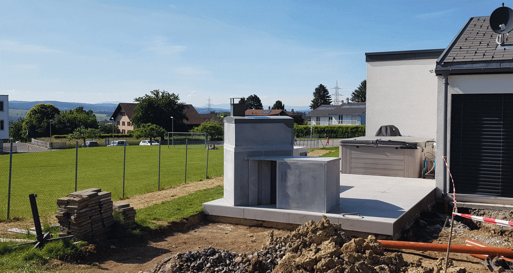 Cuisine montée sur dalle béton en pleine nature. Elle est équipée de porte en acier thermolaqué.